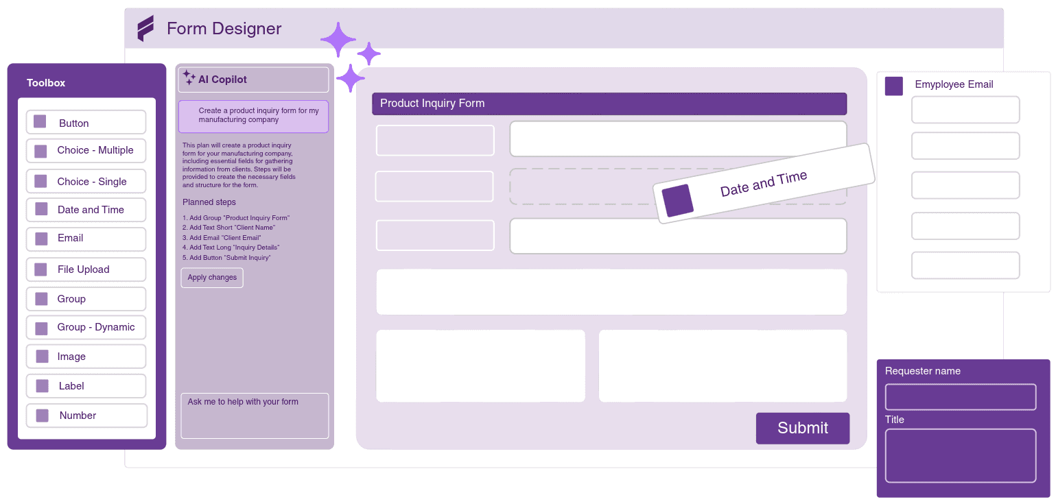 Reduce the time spent creating and managing forms with AI-assisted design. What used to take hours can now be done in minutes, allowing you to focus on real work instead of setup and rework.